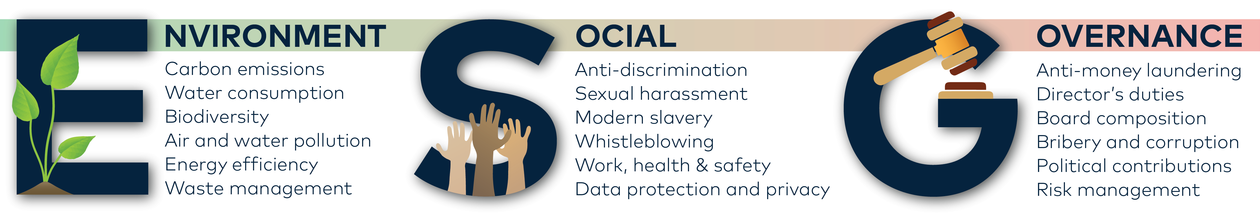 ESG has become increasingly important in the global community as customers, employees and investors seek entities whose operations and strategies are transparent in their performance. The spectrum of ESG issues is vast with just a few of the related examples below.
